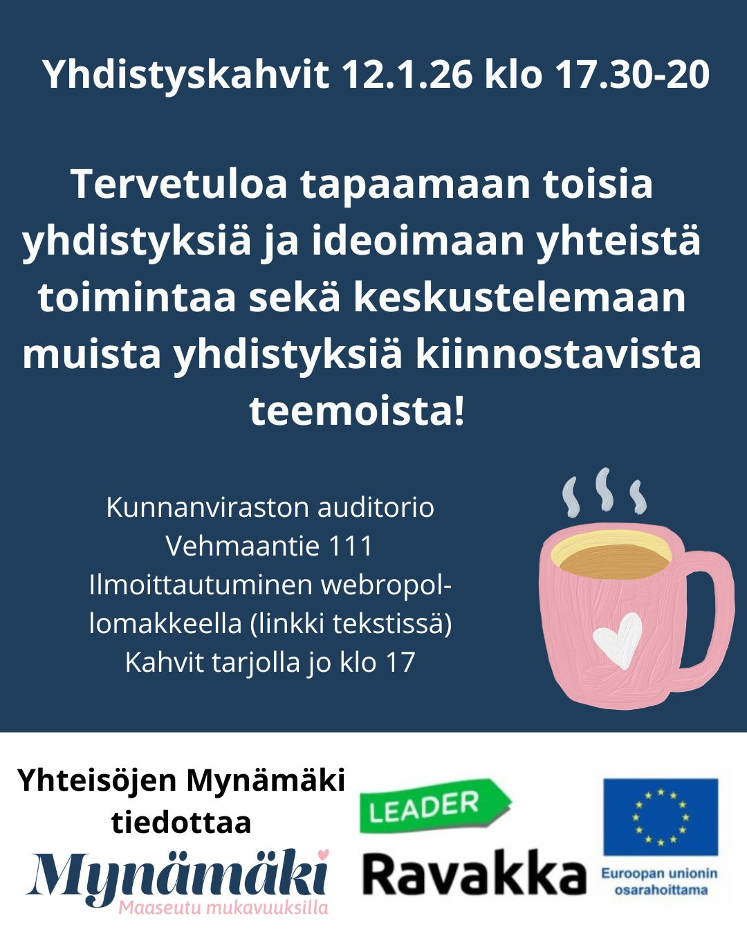 Tervetuloa Yhteisöjen Mynämäki -hankkeen järjestämille yhdistyskahveille ma 12.1.26 klo 17.30–20 Mynämäen kunnanviraston auditorioon osoitteeseen Vehmaantie 111. Tarkoituksena on kahvittelun lomassa kokoontua yhdistysten kesken vapaamuotoiseen aivoriiheen, jonka seurauksena voidaan saada ideoita...